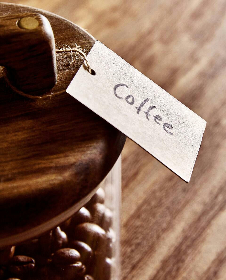 Borosilicate glass storage jar with an acacia wood lid and brass details. Includes 3 kraft paper labels and a spool of raffia to hang the labels. Available in three sizes: small, medium and large.The small jar has a capacity of 0.75 litres, the medium 1.5 litres and the large 2 litres.